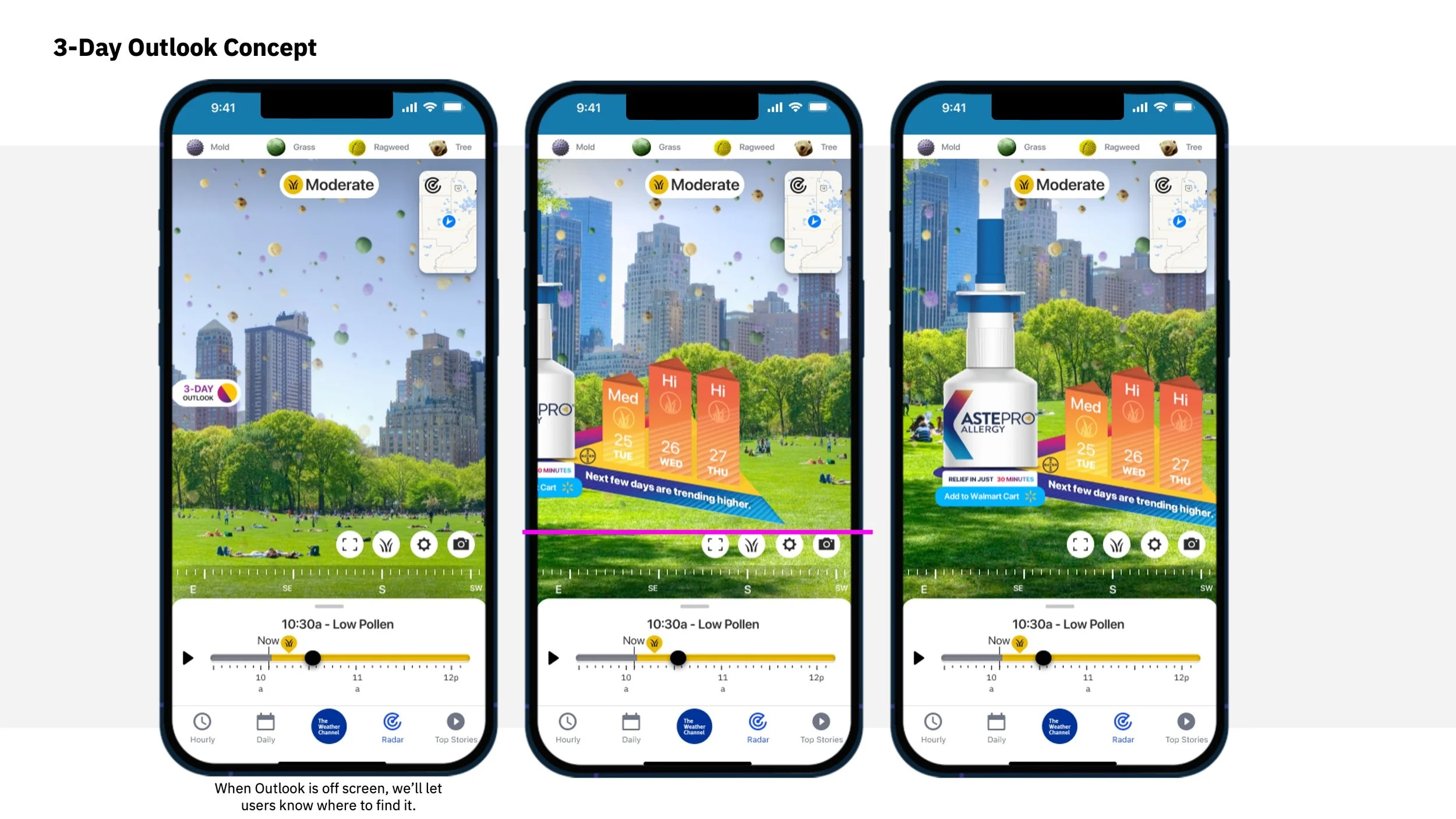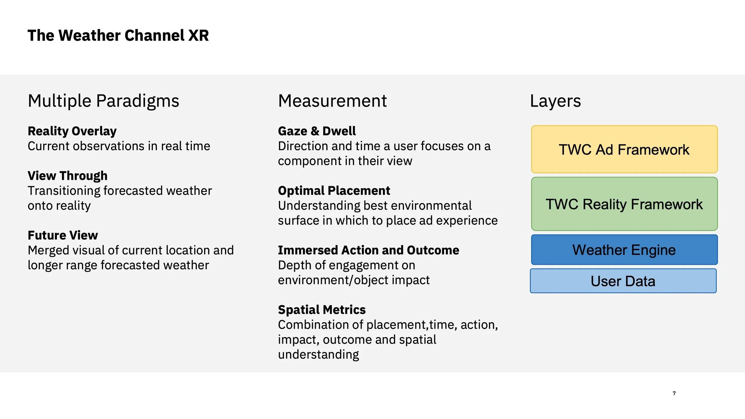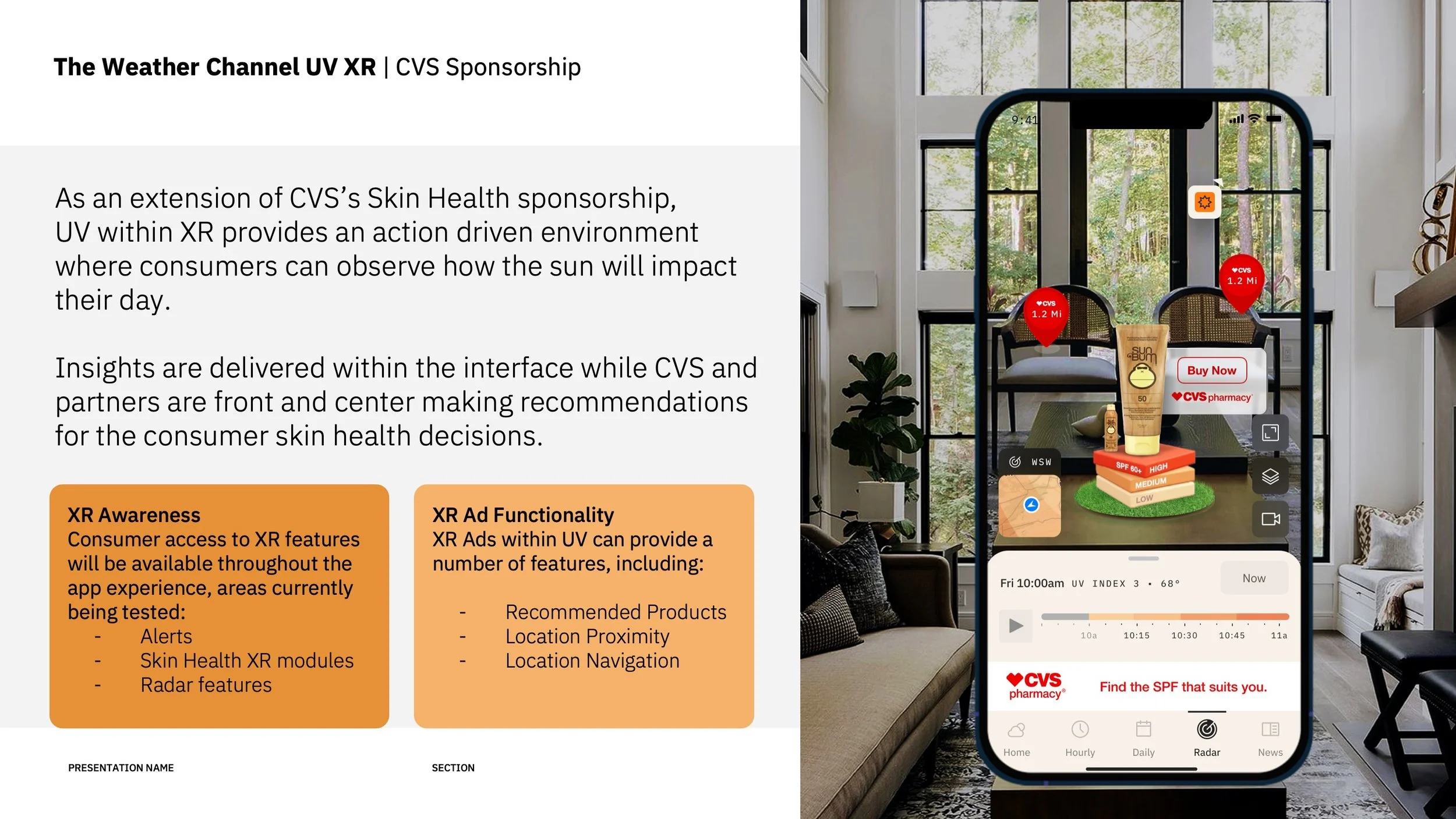 Brian spearheaded the invention and launch of The Weather Channel’s first mobile XR product—an immersive experience that overlays real-time weather data and contextual ads directly onto the user’s world. Created in partnership with Unity, the product demonstrates how AR can enhance everyday decision-making through real-time, location-specific insights.