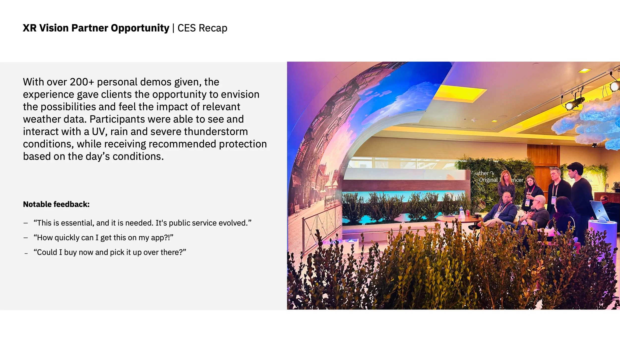 Unlike most AR/VR products built for novelty, this experience uses XR as a practical tool—offering real-time weather insights, branded content, and contextual commerce in the user’s environment. With 400M monthly active users, The Weather Channel is uniquely positioned to normalize this utility-first AR and lead in emerging Web3 and metaverse ecosystems.