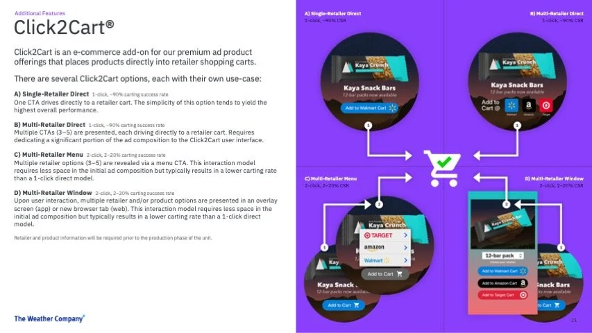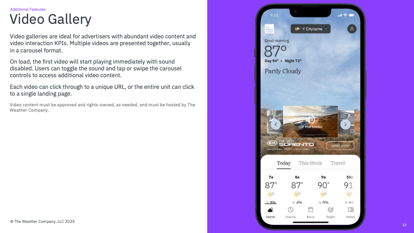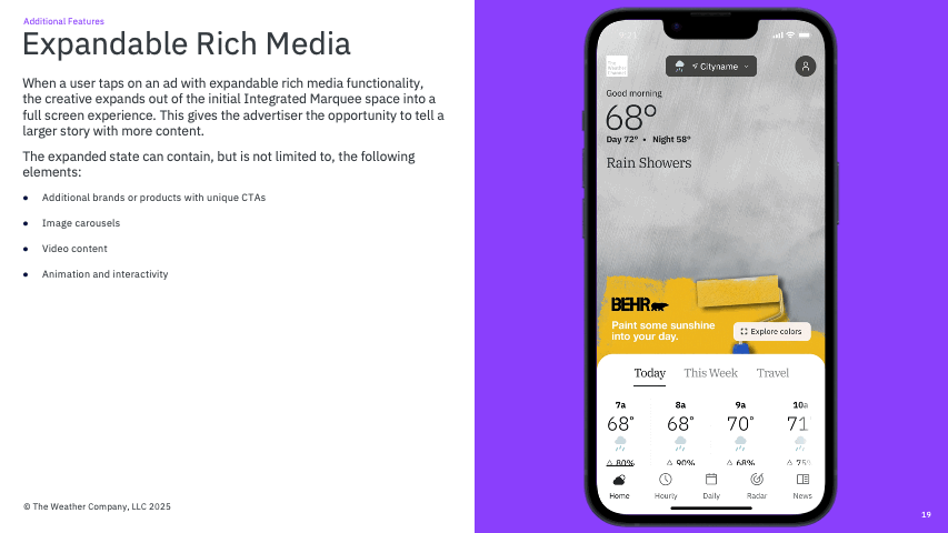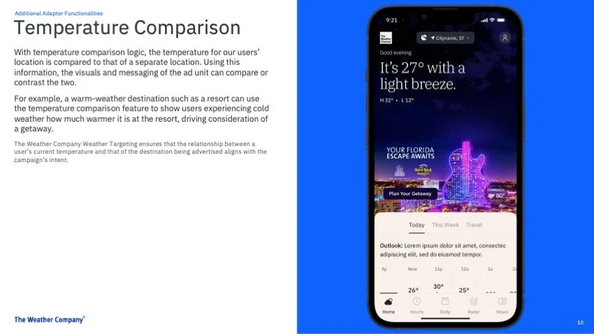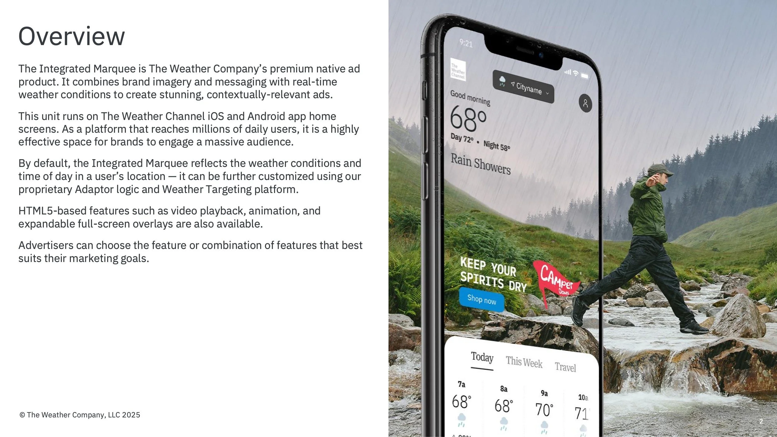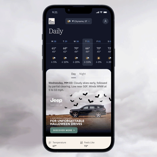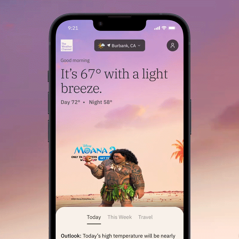 The Weather Channel’s 400M+ MAUs make it the number one most used weather app and digital platform. This highest performing, award-winning, natively integrated ad product helps brands own habitual planning and decision moments with near-real-time weather and location data to present beautifully crafted contextually relevant messages.
