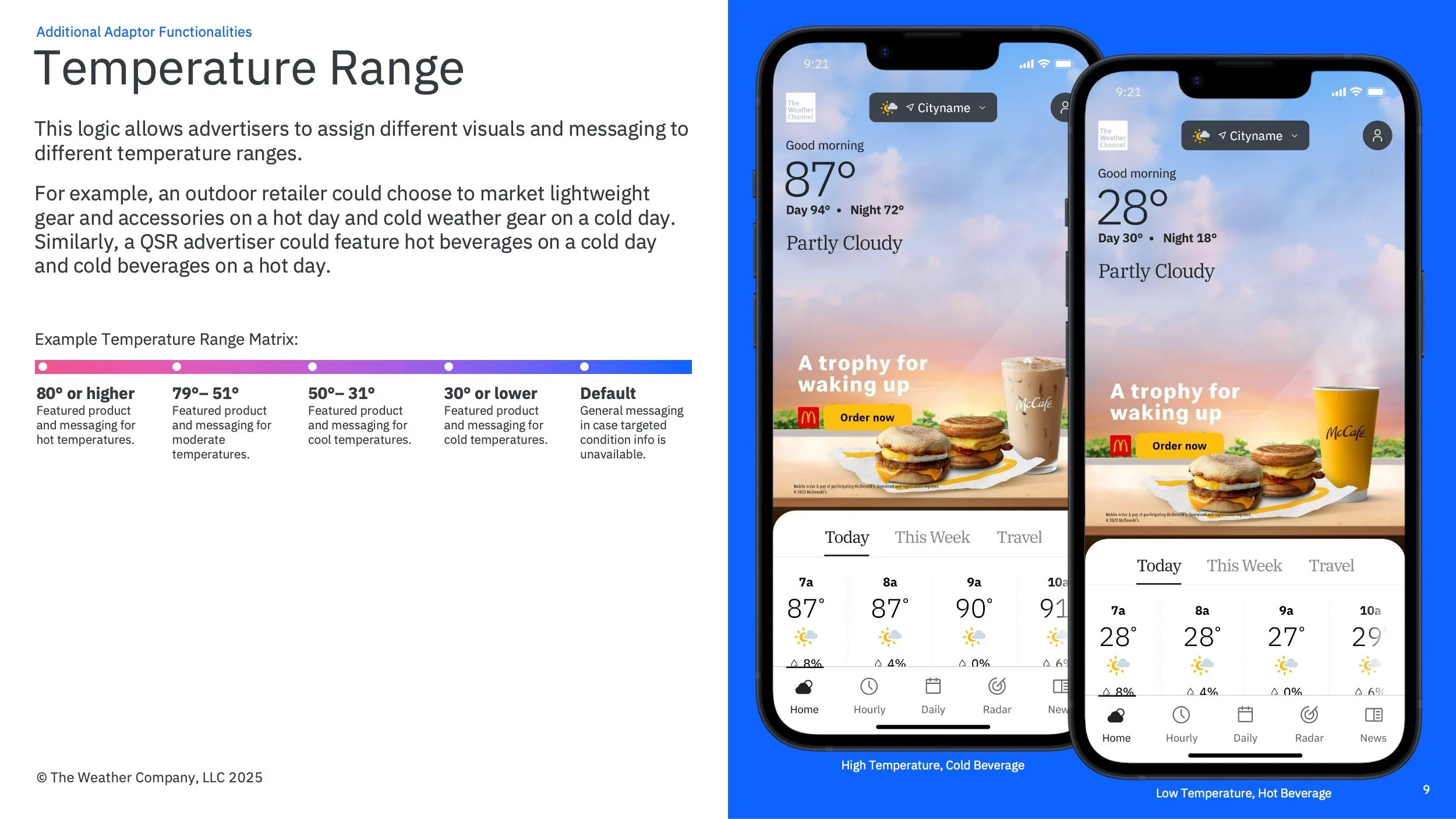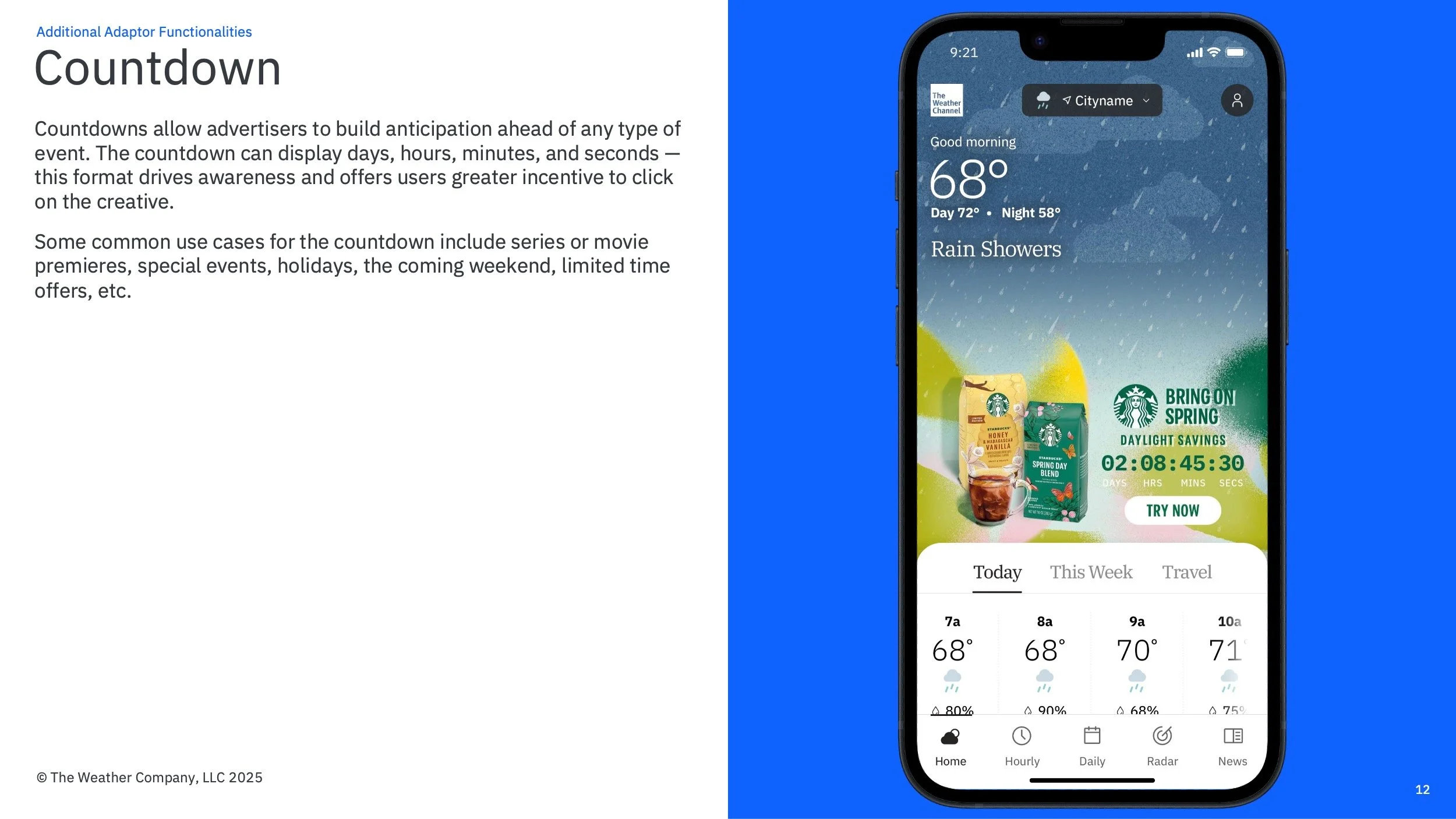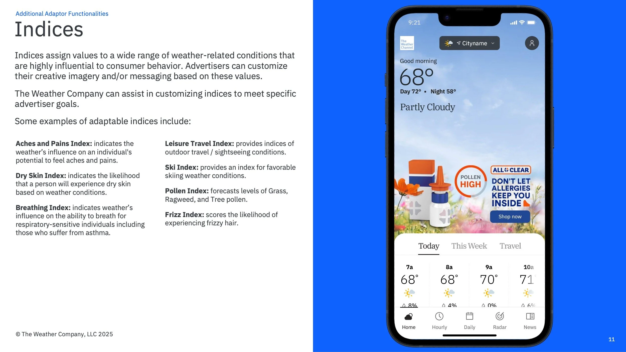 The Weather Channel’s 400M+ MAUs make it the number one most used weather app and digital platform. This highest performing, award-winning, natively integrated ad product helps brands own habitual planning and decision moments with near-real-time weather and location data to present beautifully crafted contextually relevant messages.