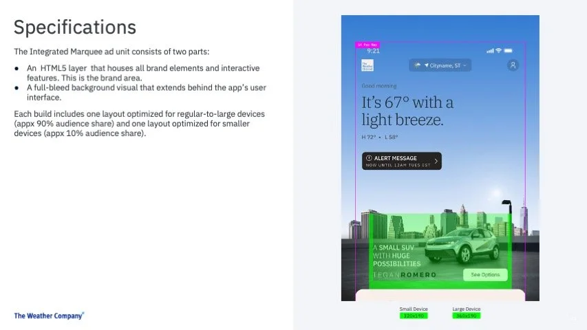 Scroll below to see an example and spec overview for the award-winning Integrated Marquee native ad for the mobile app, or click the below link to explore the entire suite of unique adaptive integrated ad products: